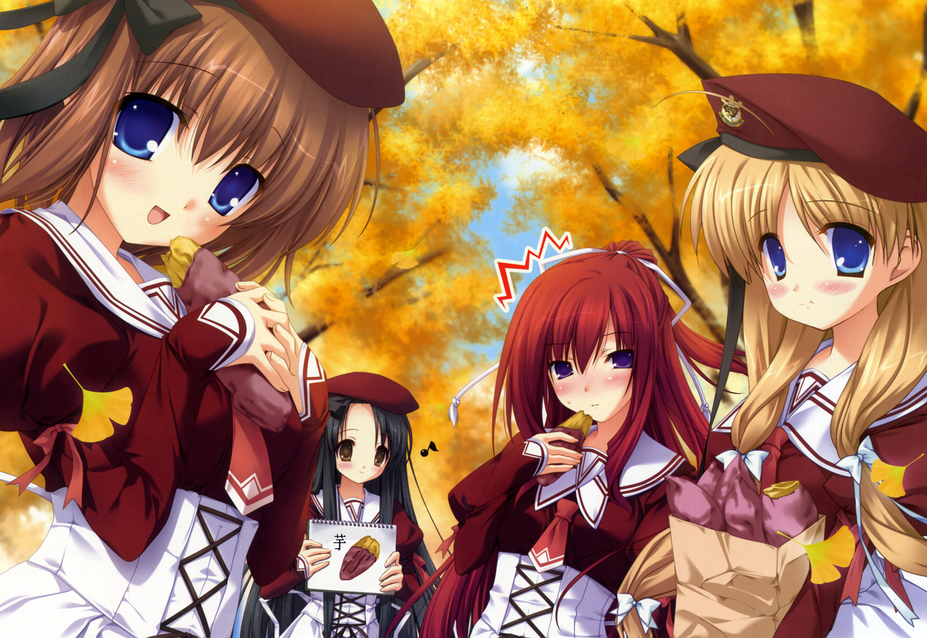 Description: A group of anime girls standing next to each other in front of a tree with leaves on it and a sky background.