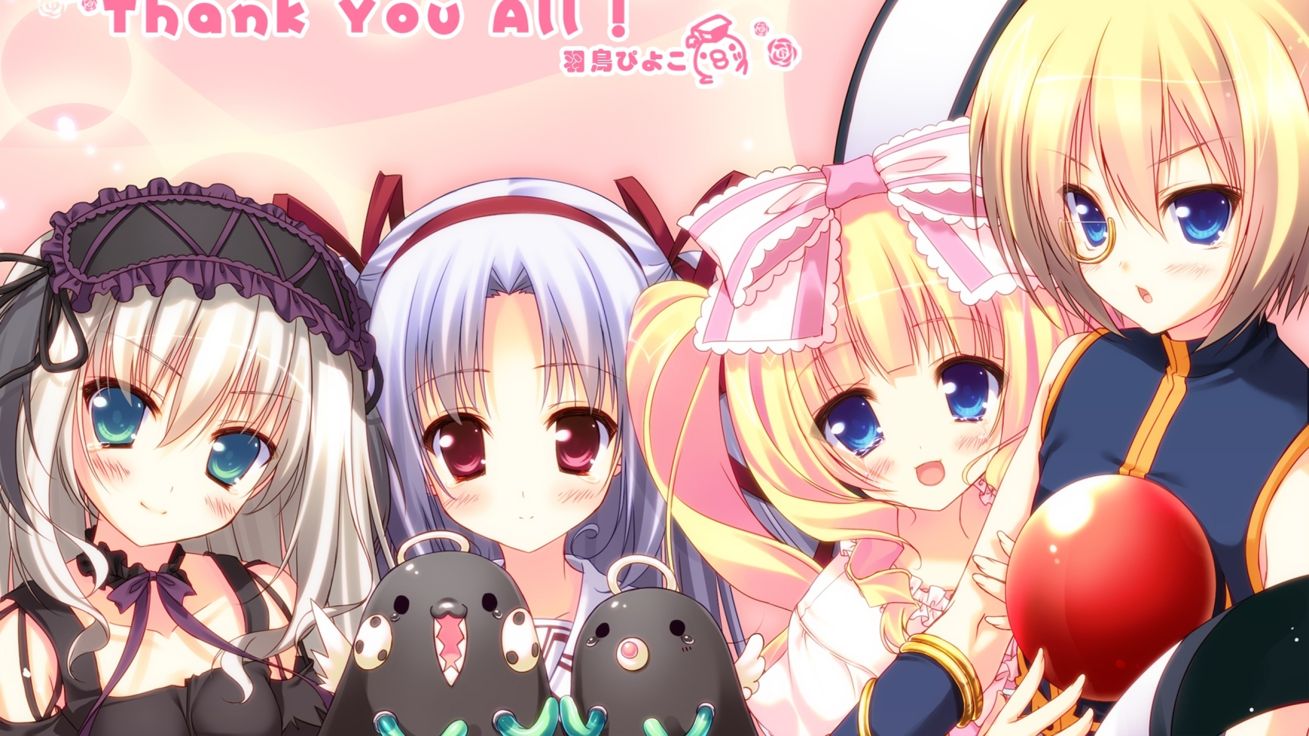 Description: A group of anime girls with balloons and balloons in front of a pink background with a thank you all message.