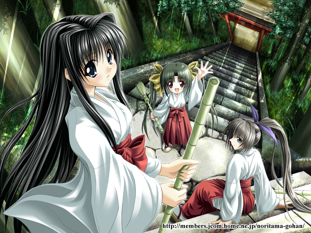 Description: A group of anime girls walking down a path in the woods with a person holding a pole in the air.