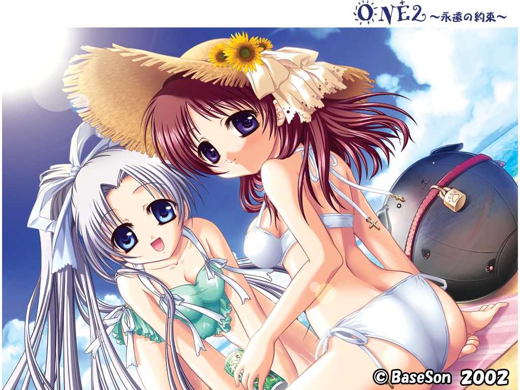 Description: Two anime girls in bikinis and hats with a helmet on their head and a helmet on their head.