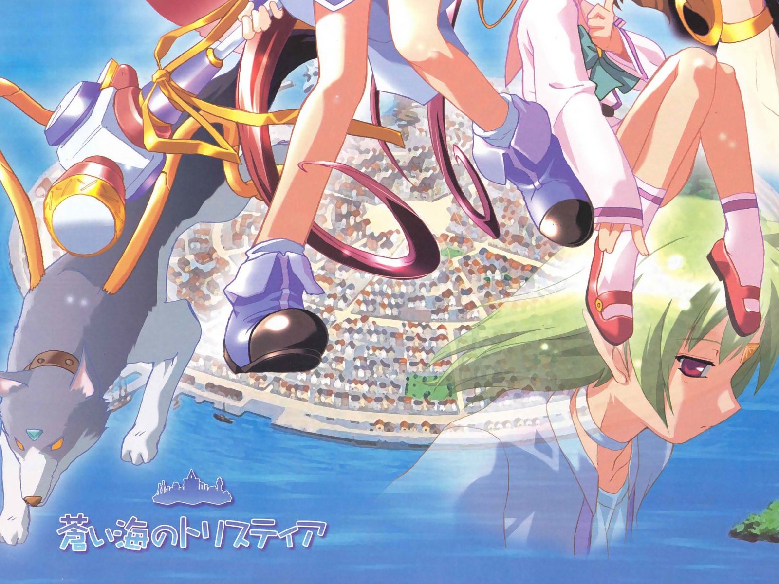 Description: A group of anime girls standing next to each other on a beach with a dog in the background and a man on a horse.