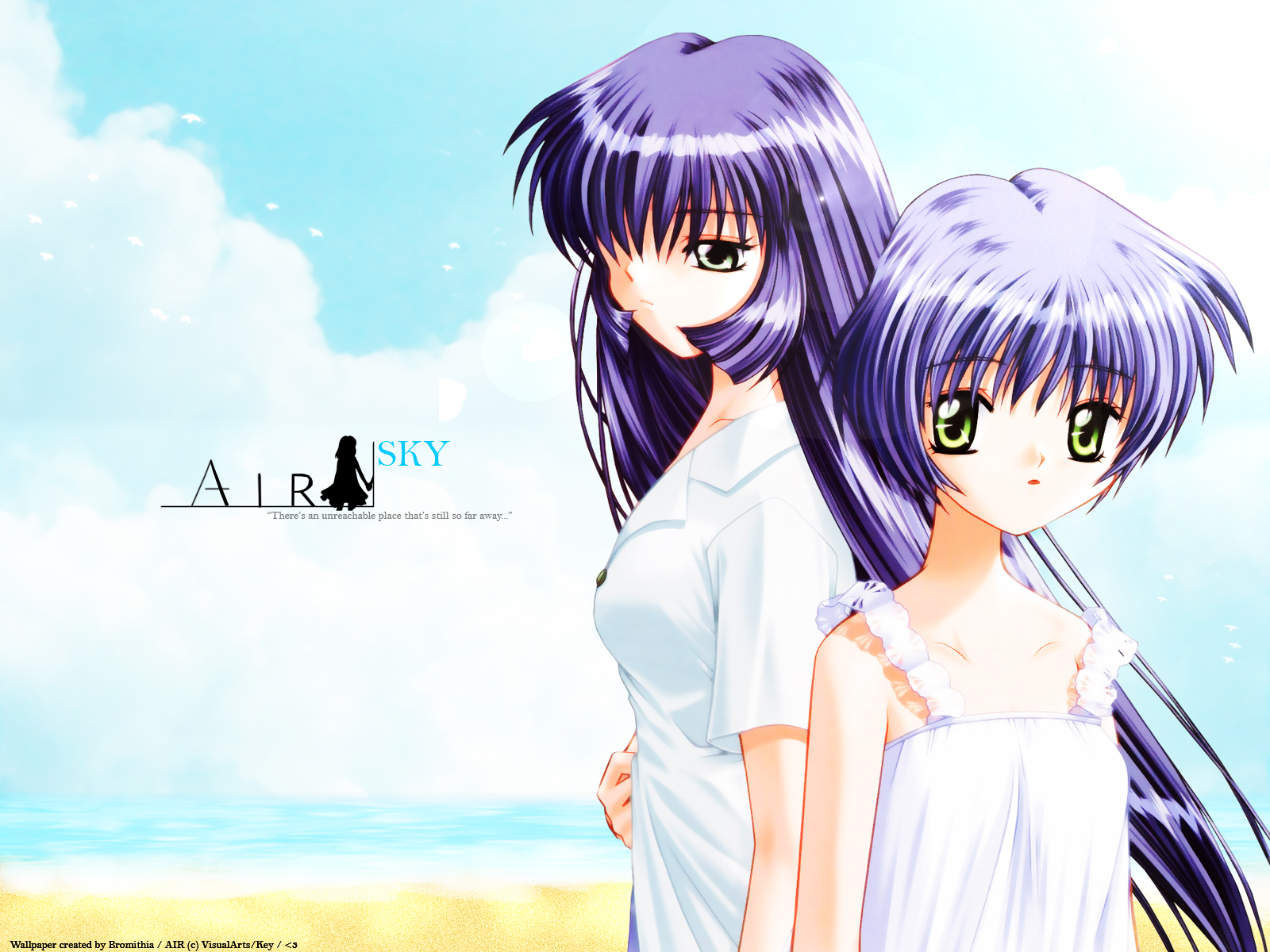Description: Two anime girls standing next to each other on a beach with a sky background and clouds in the background.