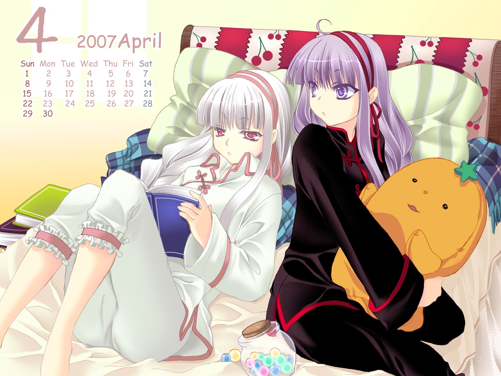 Description: A couple of anime girls sitting on a bed together with a teddy bear in their lap and a calendar in the background.