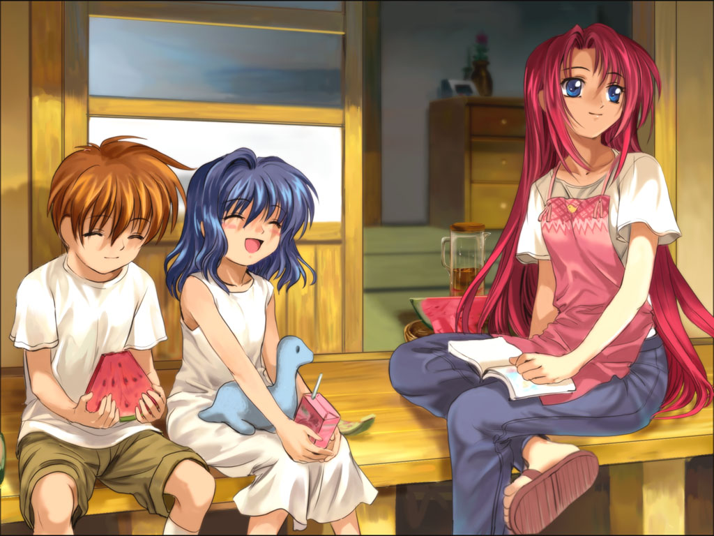 Description: Three anime girls sitting on a bench with a book and a watermelon in their hands and a boy with a book.