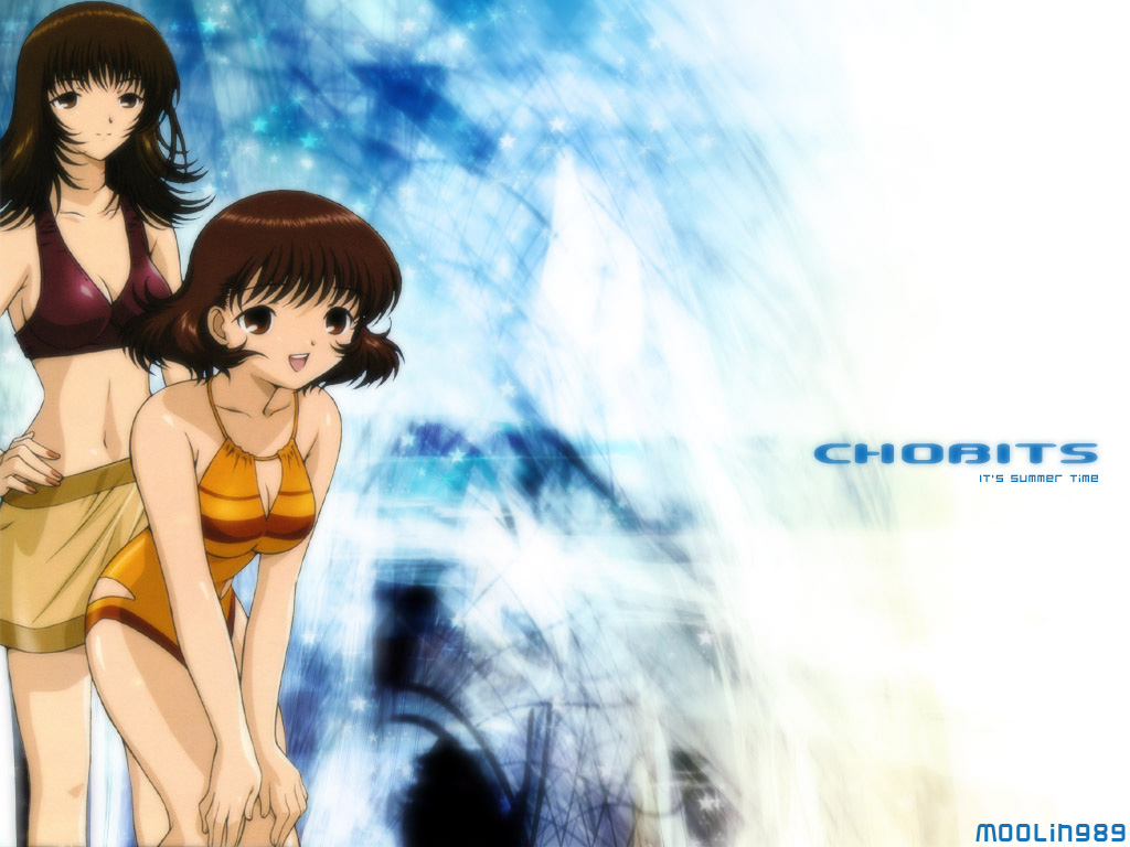 Description: Two anime girls in bikinis standing next to each other in front of a blue background with a white swirl.