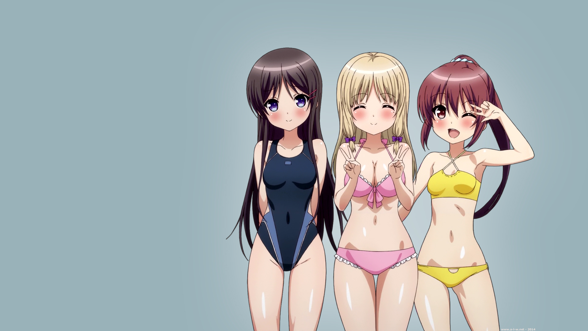 Description: Three anime girls in bikinis standing next to each other with their hands on their hipss and one holding a cell phone.