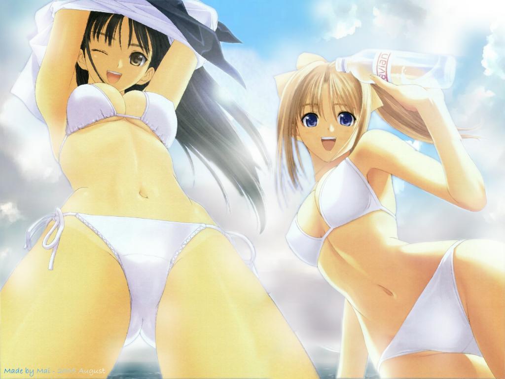 Description: Two anime girls in bikinis and hats standing next to each other with a cloudy sky behind them and one of them holding a bottle.