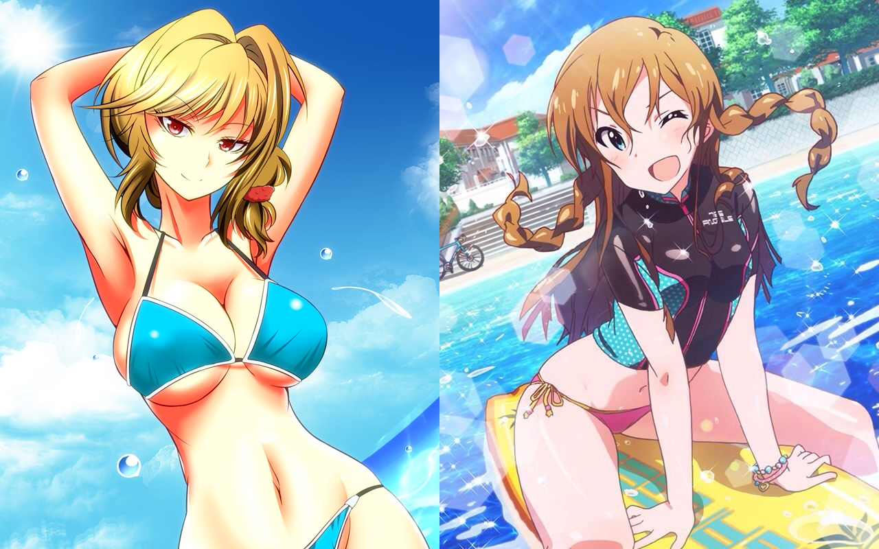 Description: Two anime girls in bikinis sitting on a surfboard in the water and one in a bikini on the beach.