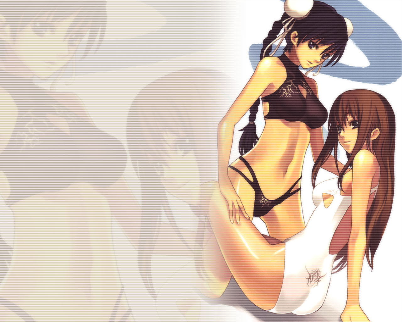 Description: Two anime girls in bikinis and one is posing for a picture with a ball on her head and a tennis ball on her head.