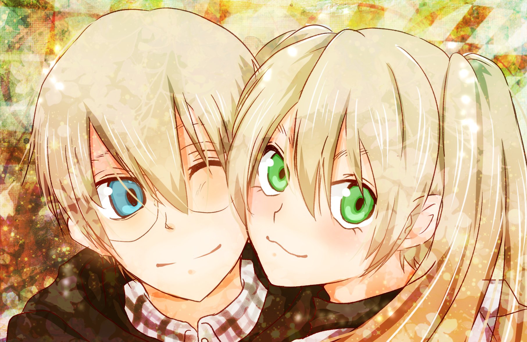 Description: Two anime girls with green eyes and blonde hair.