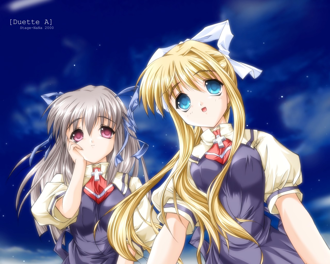 Description: Two anime girls with long blonde hair and blue eyes are standing in front of a blue sky with clouds.