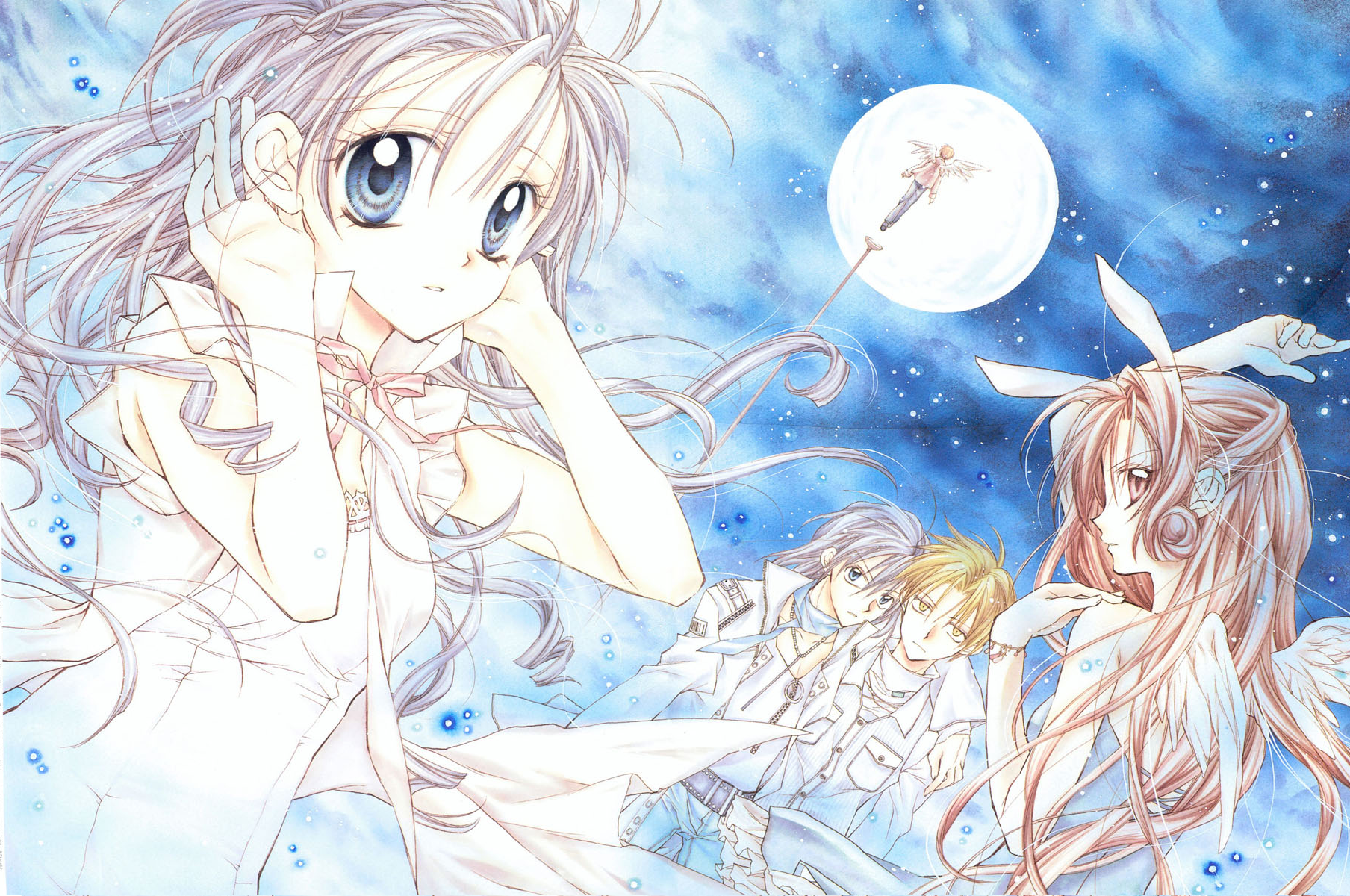 Description: A group of anime girls sitting next to each other on a blue background with a full moon in the sky.