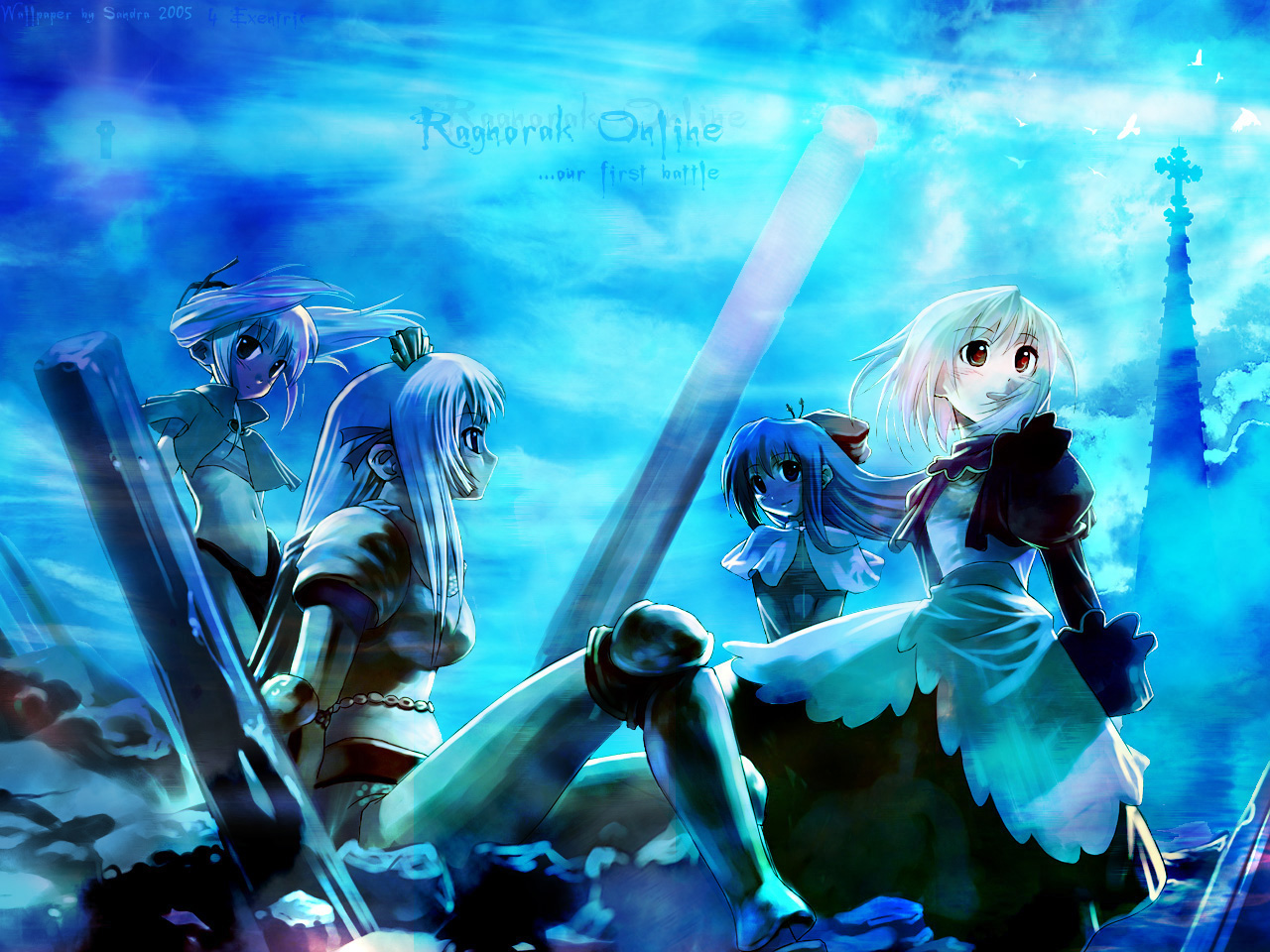 Description: A group of anime girls sitting on top of a blue background with clouds in the background and a sky with clouds.