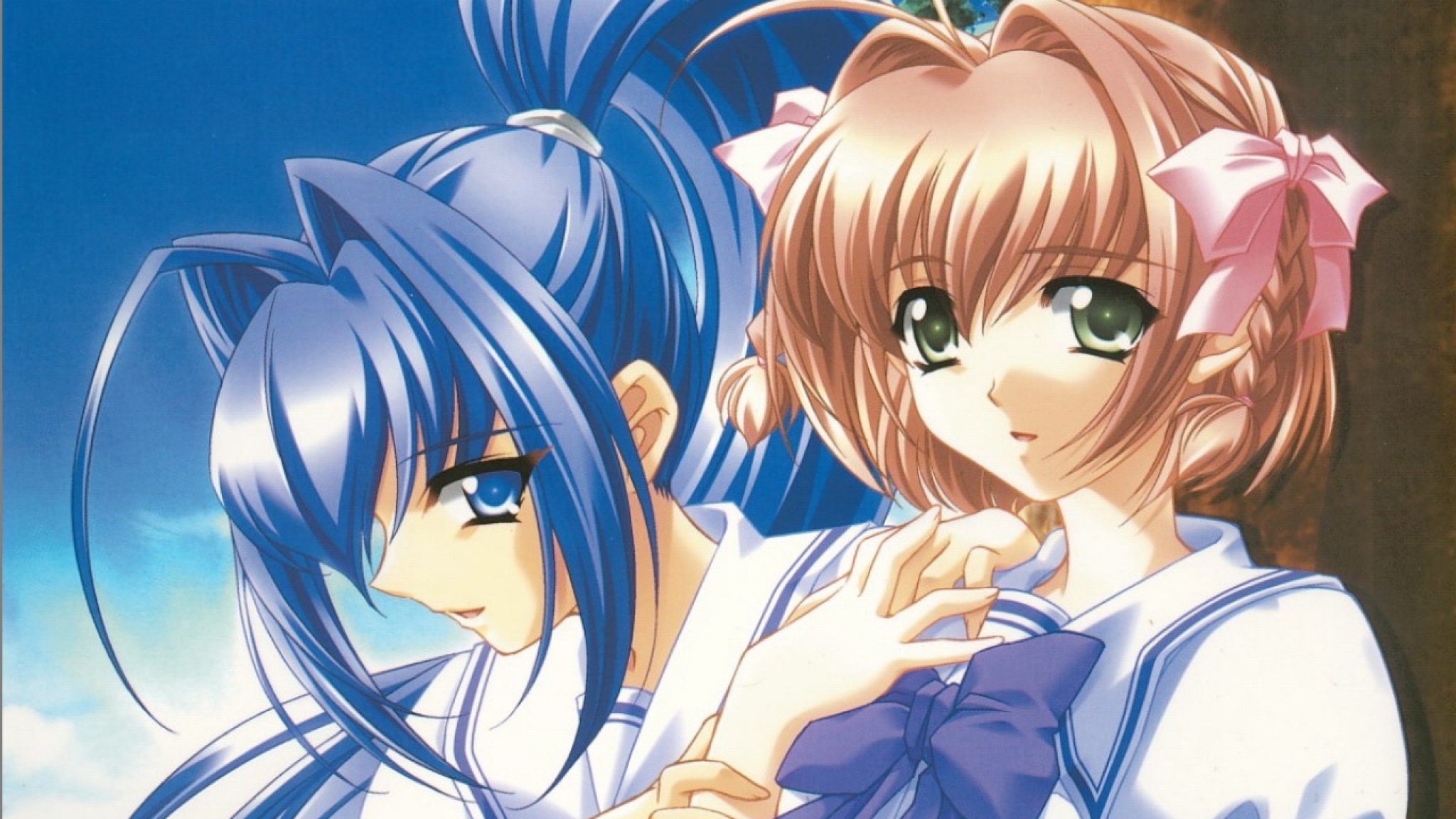 Description: Two anime girls with blue hair and green eyes are standing together in front of a tree and sky background.