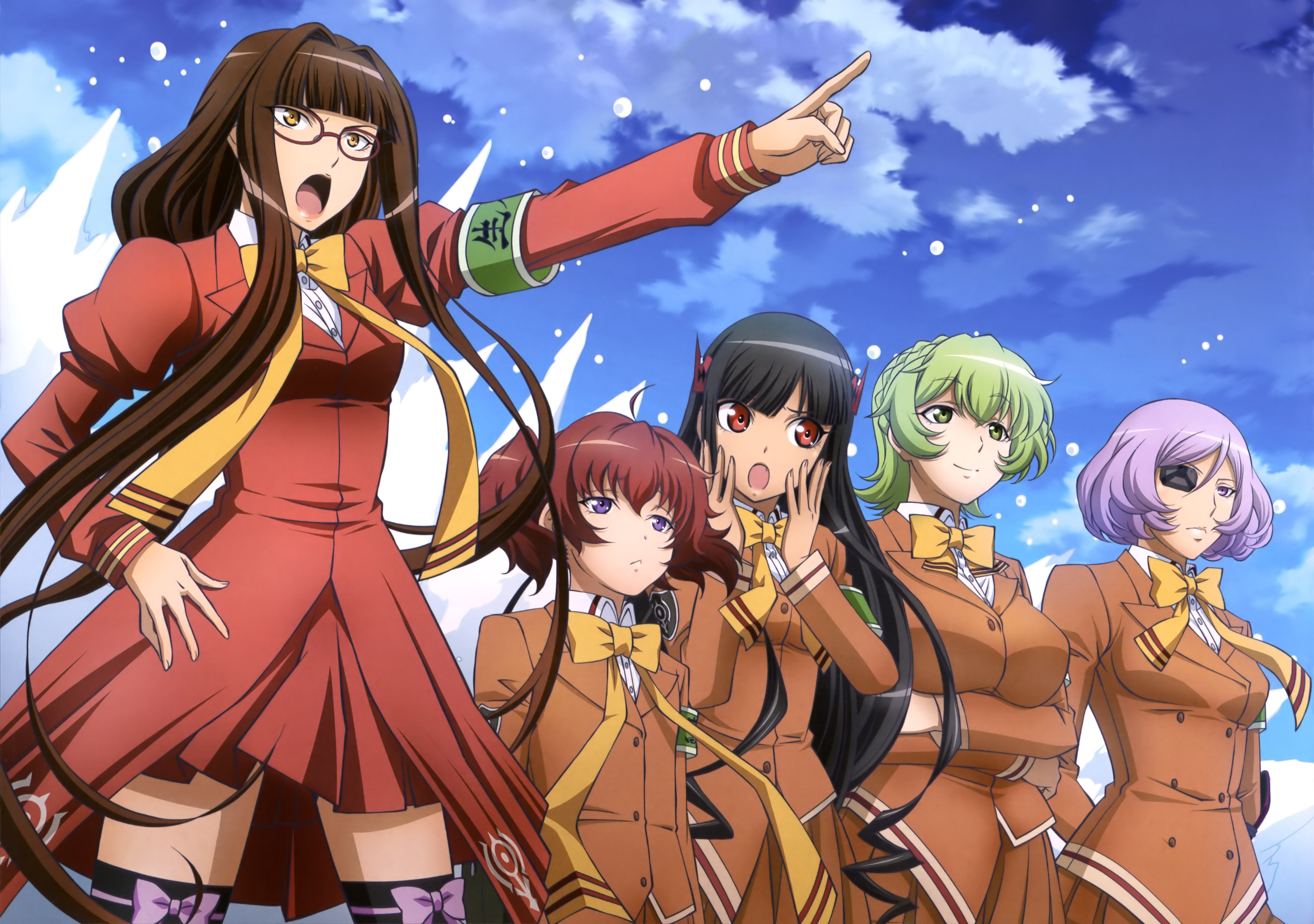 Description: A group of anime girls standing next to each other in front of a blue sky with clouds and stars.