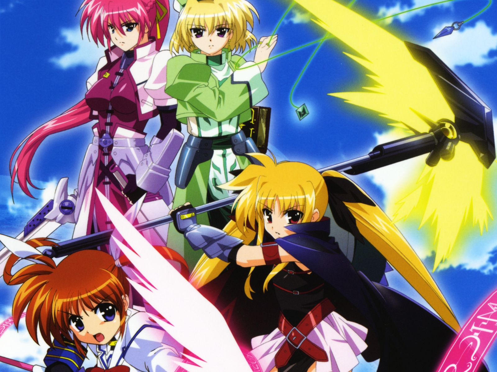 Description: A group of anime girls standing next to each other on a blue sky background with clouds and stars in the background.