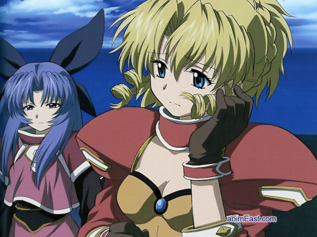 Description: Two anime characters standing next to each other in front of a blue sky and clouds with a blue sky in the background.