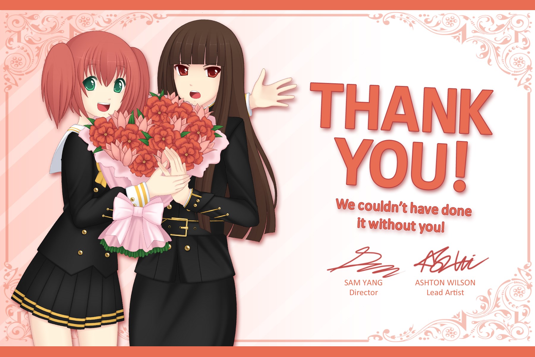 Description: A couple of anime girls holding a bouquet of flowers with a thank you card in the background that says.