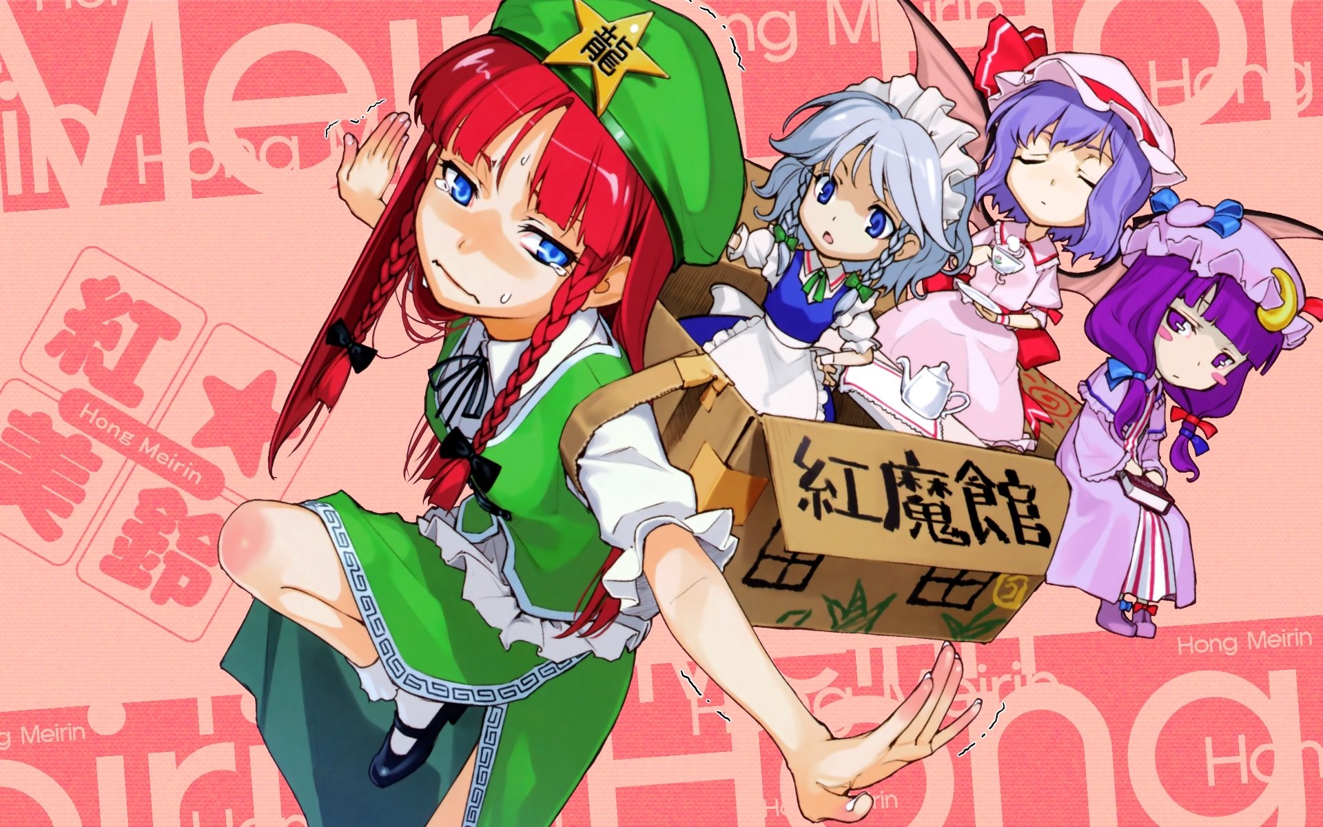 Description: A group of anime girls with boxes in their hands and a pink background with words written in chinese and english.