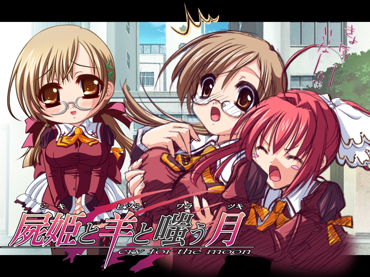 Description: A group of anime girls standing next to each other in front of a building with a clock on it.