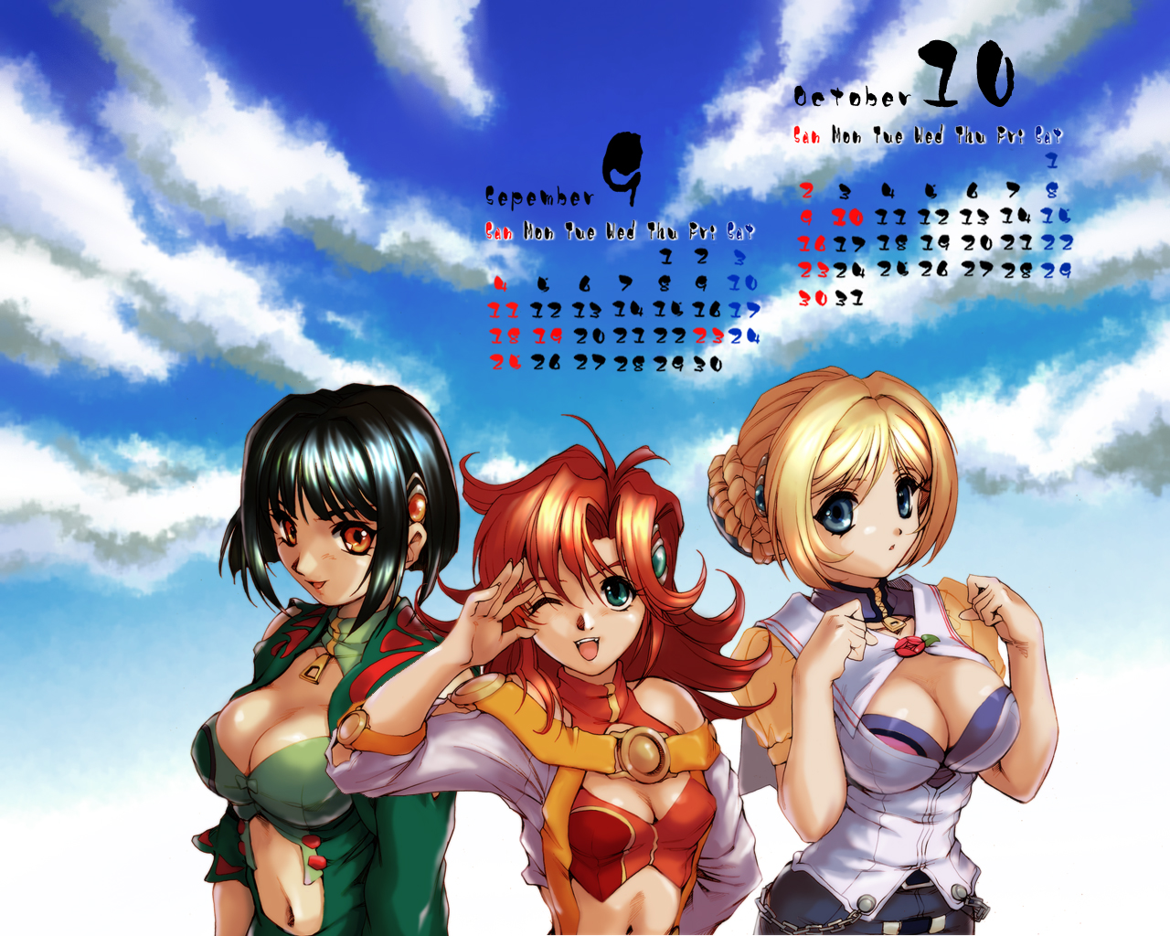 Description: A calendar with three anime characters in front of a blue sky with clouds and clouds behind them.