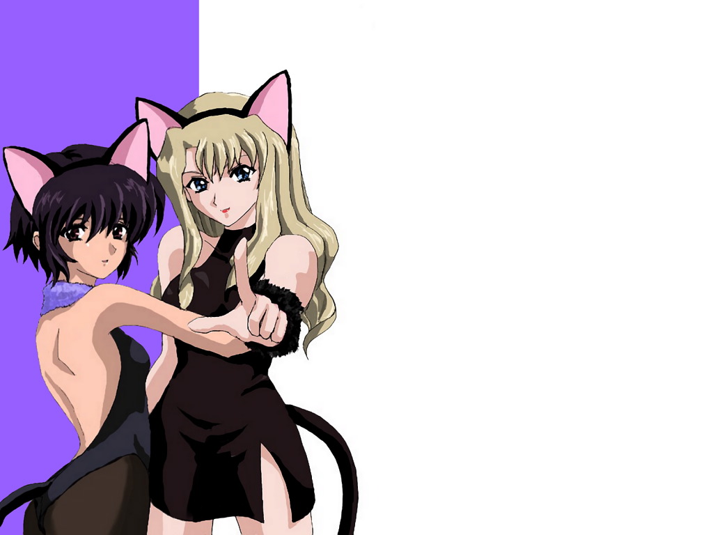 Description: Two anime characters posing for a picture with a cat on their back and a cat on their arm.