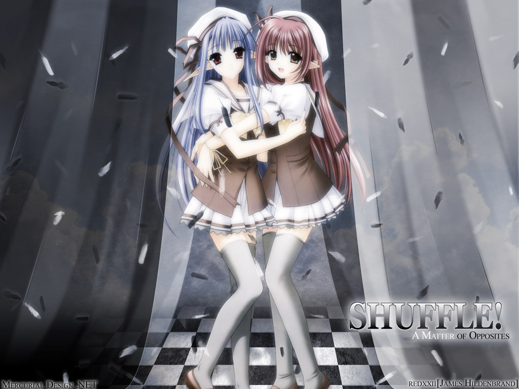 Description: Two anime girls standing in front of a checkered floor with trees in the background and falling leaves in the foreground.