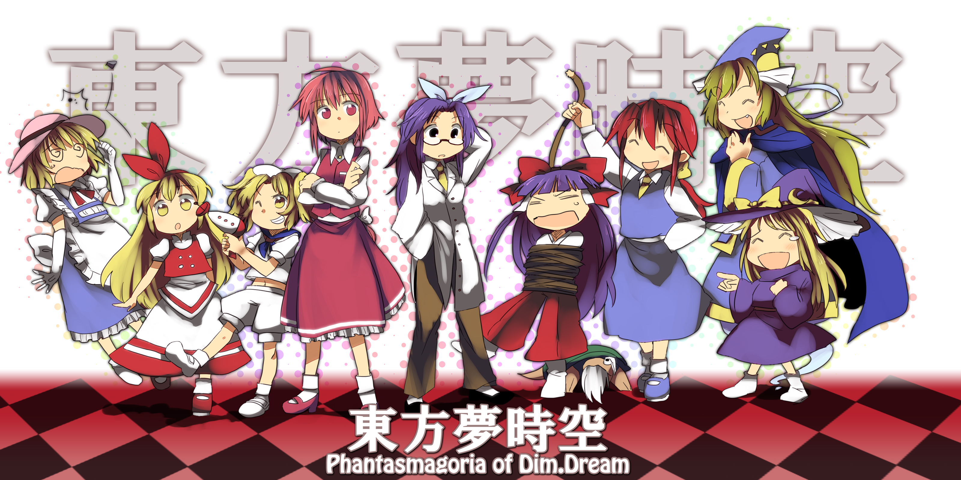 Description: A group of anime girls standing next to each other on a checkered floor with the words phantasana of umi - dream written in english.