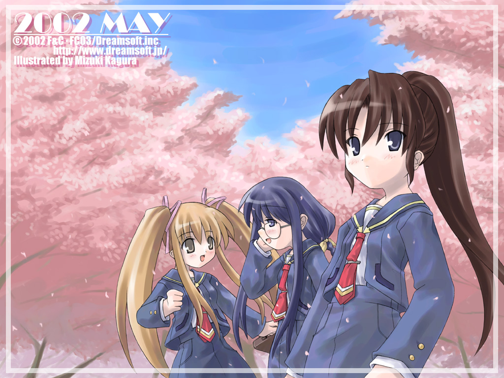 Description: A group of anime girls standing next to each other in front of a tree with pink flowers in the background.