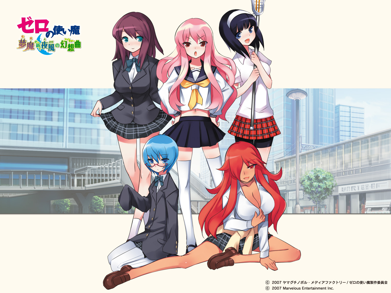 Description: A group of anime girls standing next to each other in front of a building with a clock on it.