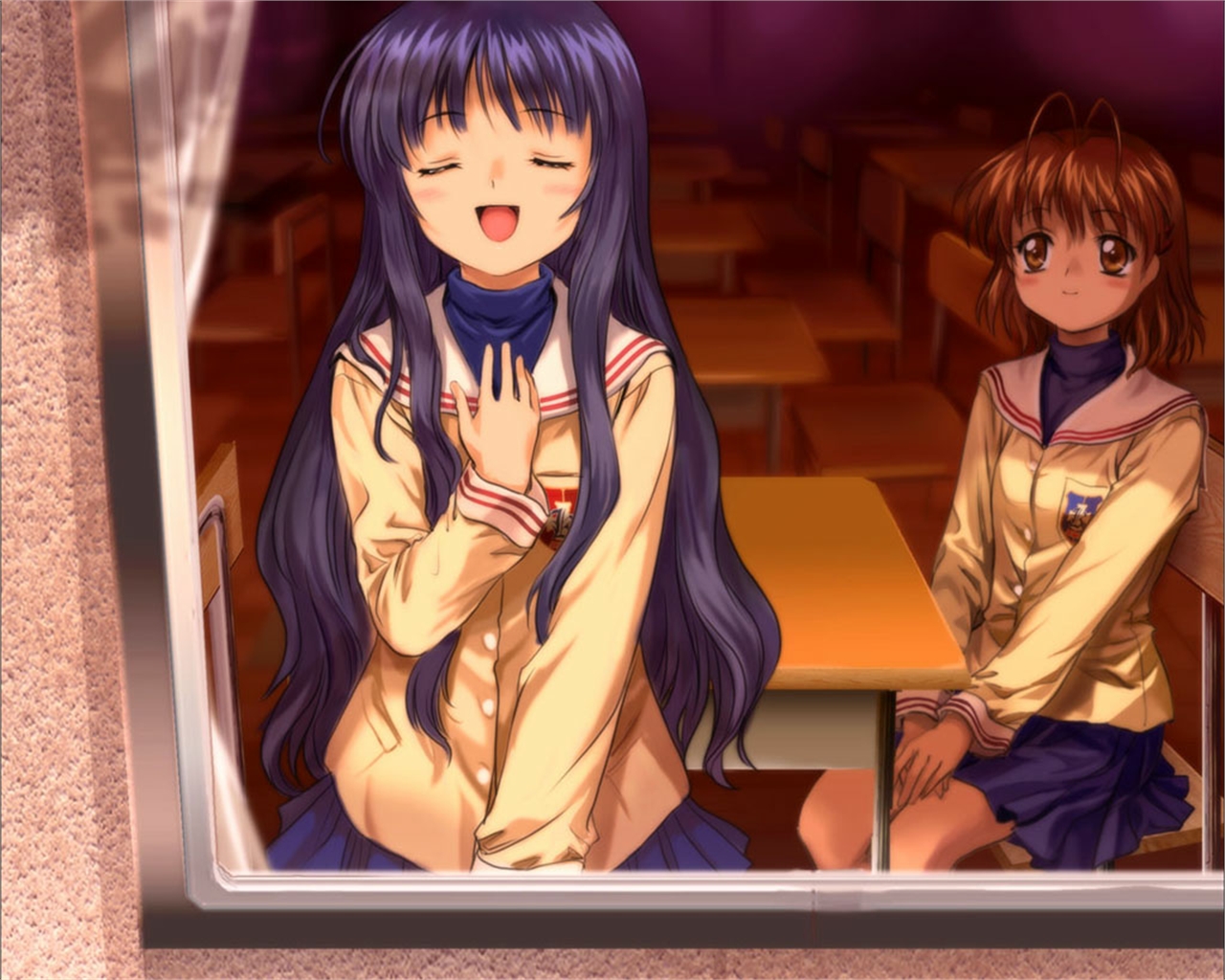Description: Two anime girls sitting at a table in a classroom with their hands together and their faces closed.