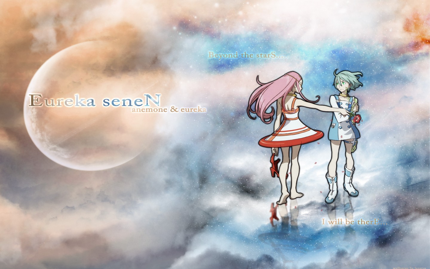 Description: Two anime girls standing on a cloud with a moon in the background and a sky with clouds and a half moon.