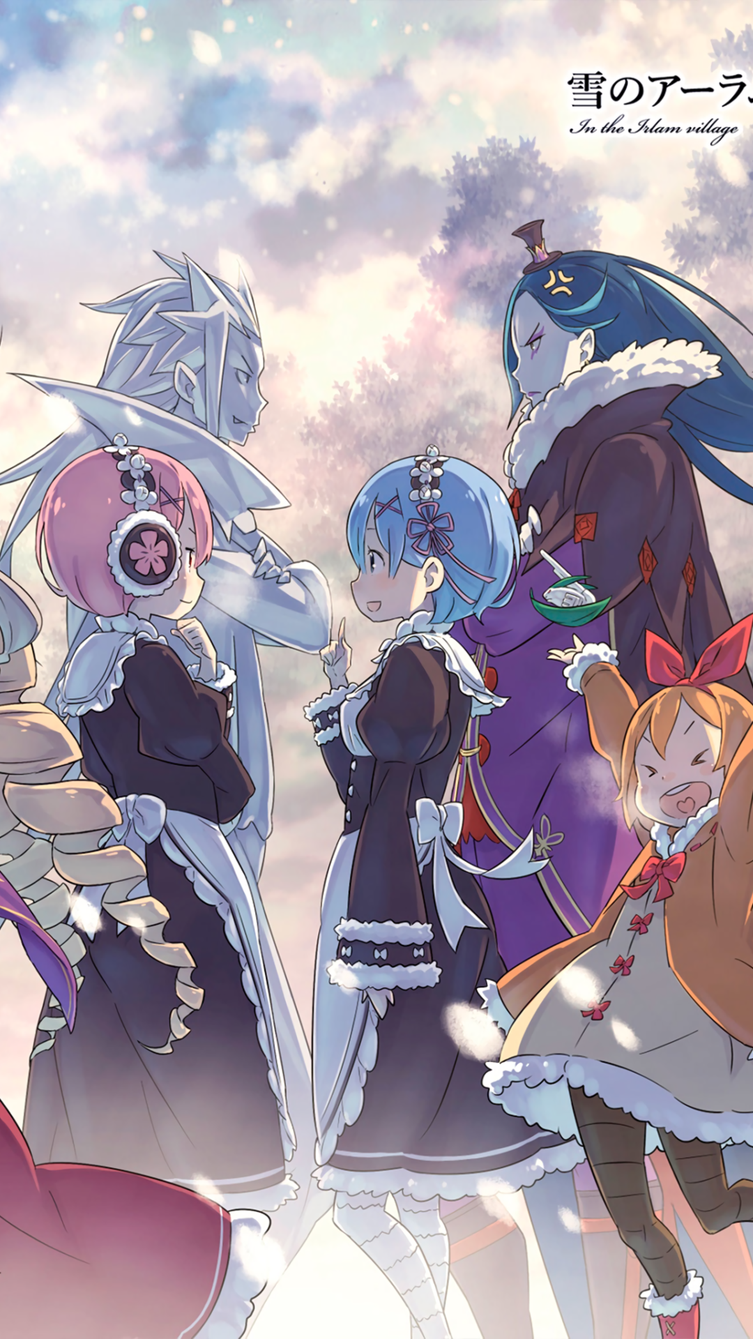 Description: A group of anime girls standing next to each other in front of a cloudy sky with stars and clouds.