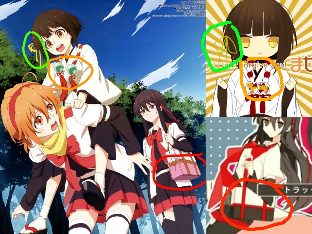 Description: A group of anime girls with different colored circles around them and a picture of a man holding a woman.