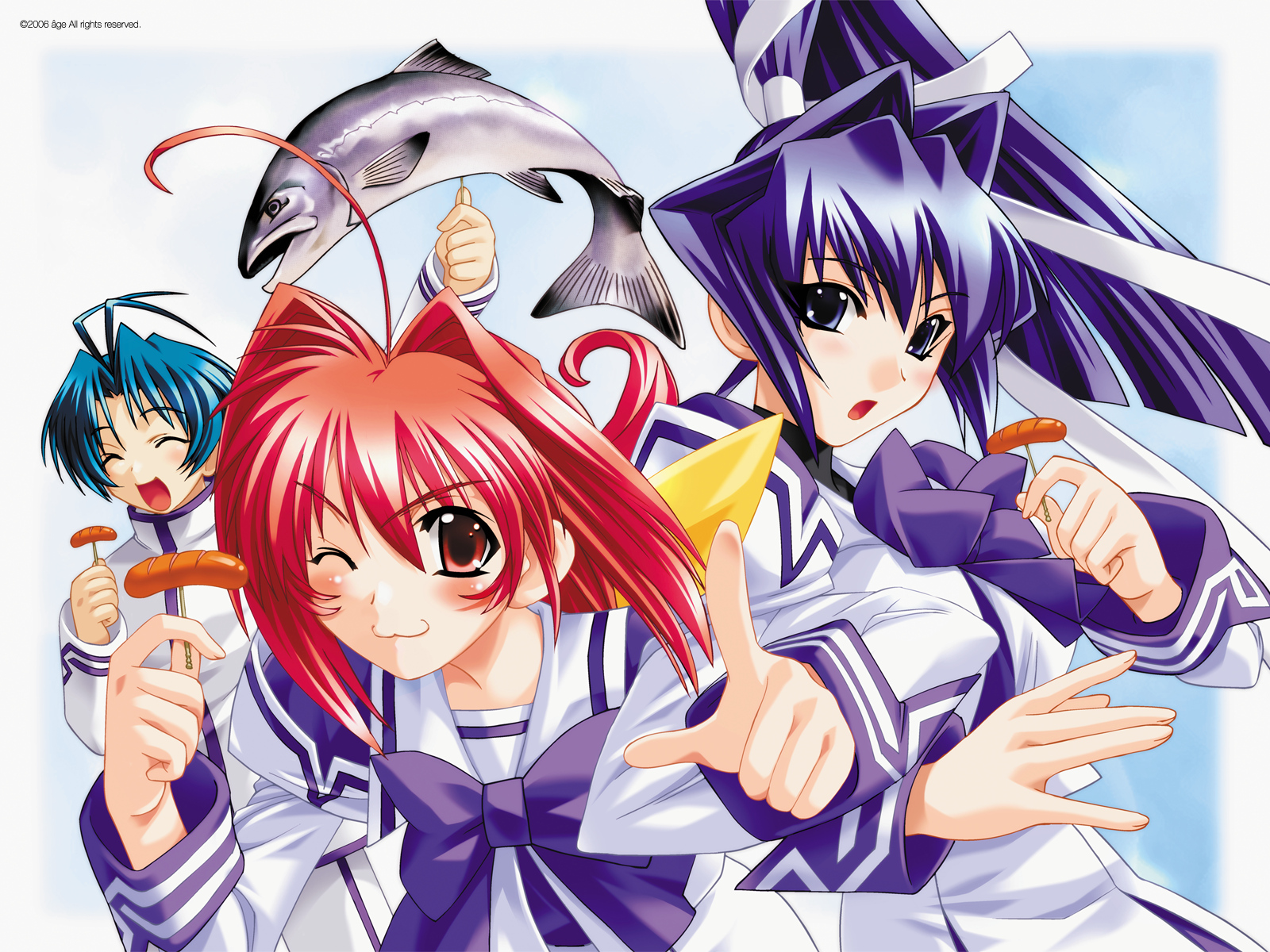 Description: A group of anime girls with different colored hair and hats on their heads and arms.
