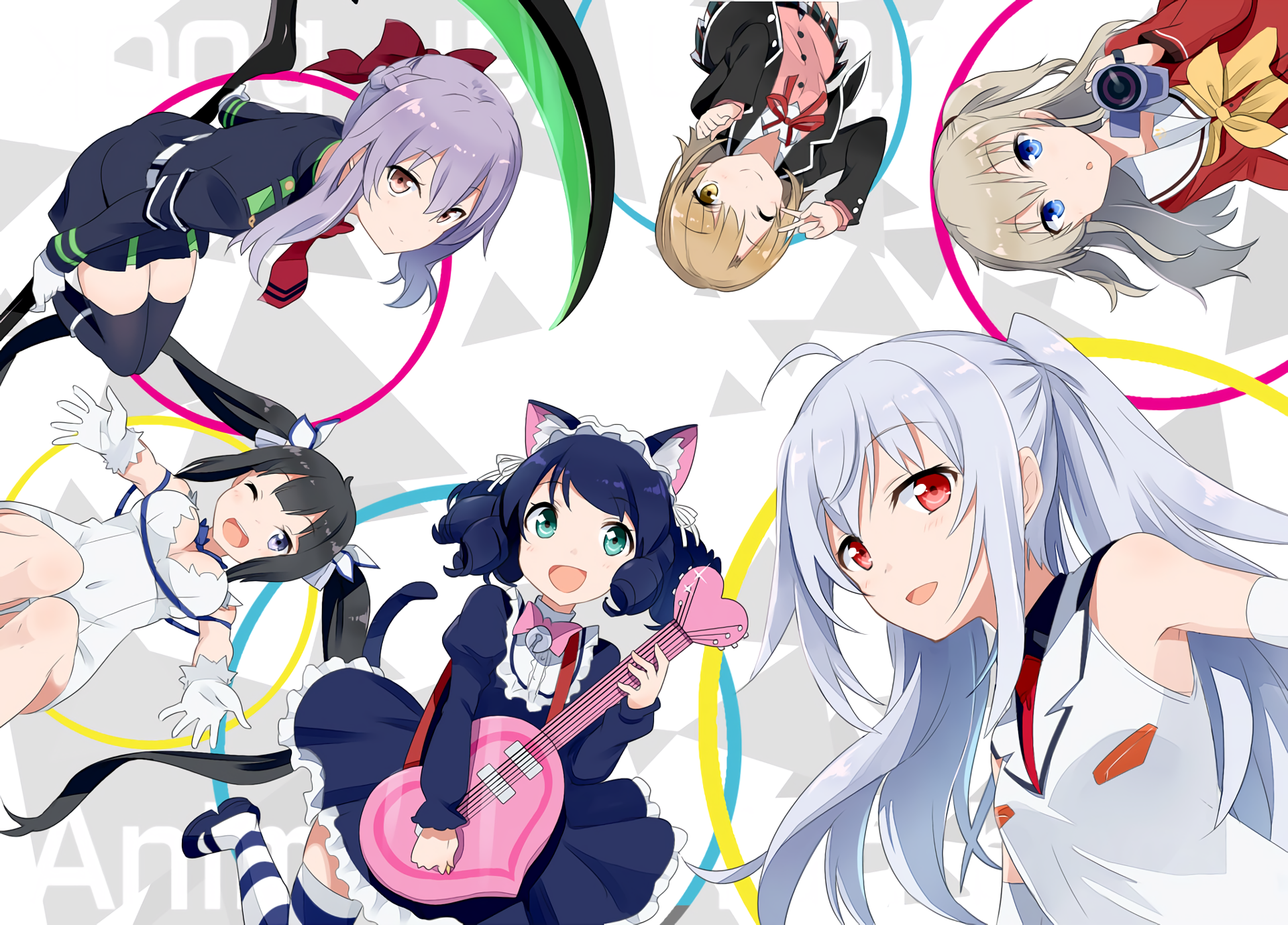 Description: A group of anime girls with different colored hair and makeup playing guitars and singing with their heads tilted to the side.