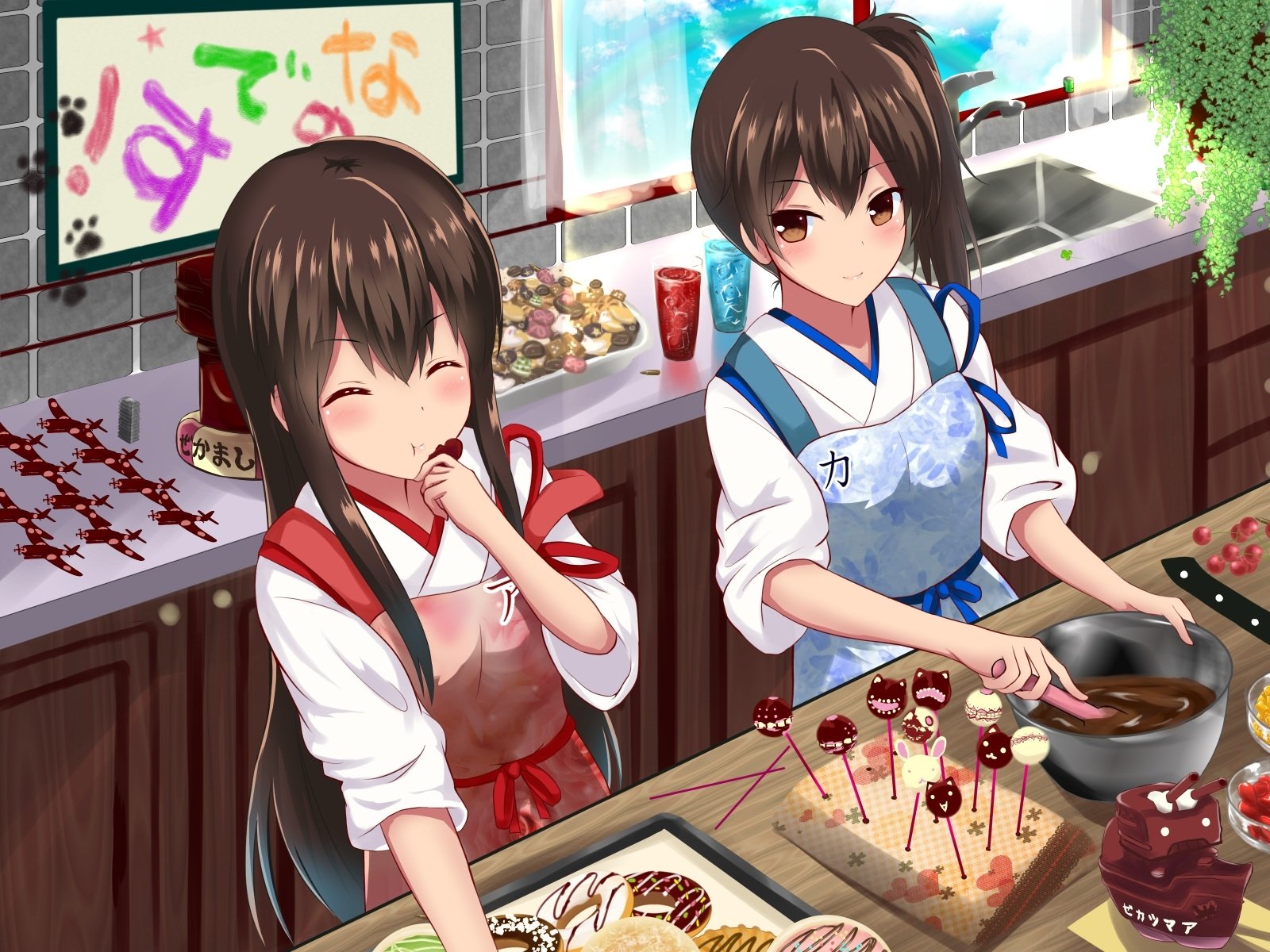 Description: Two anime girls cooking food in a kitchen together.