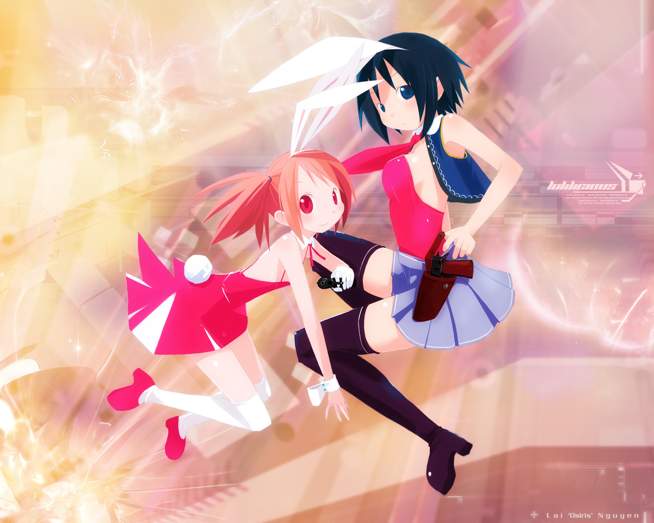 Description: Two anime girls are dancing together in a dance pose with a pink background and a yellow background behind them.