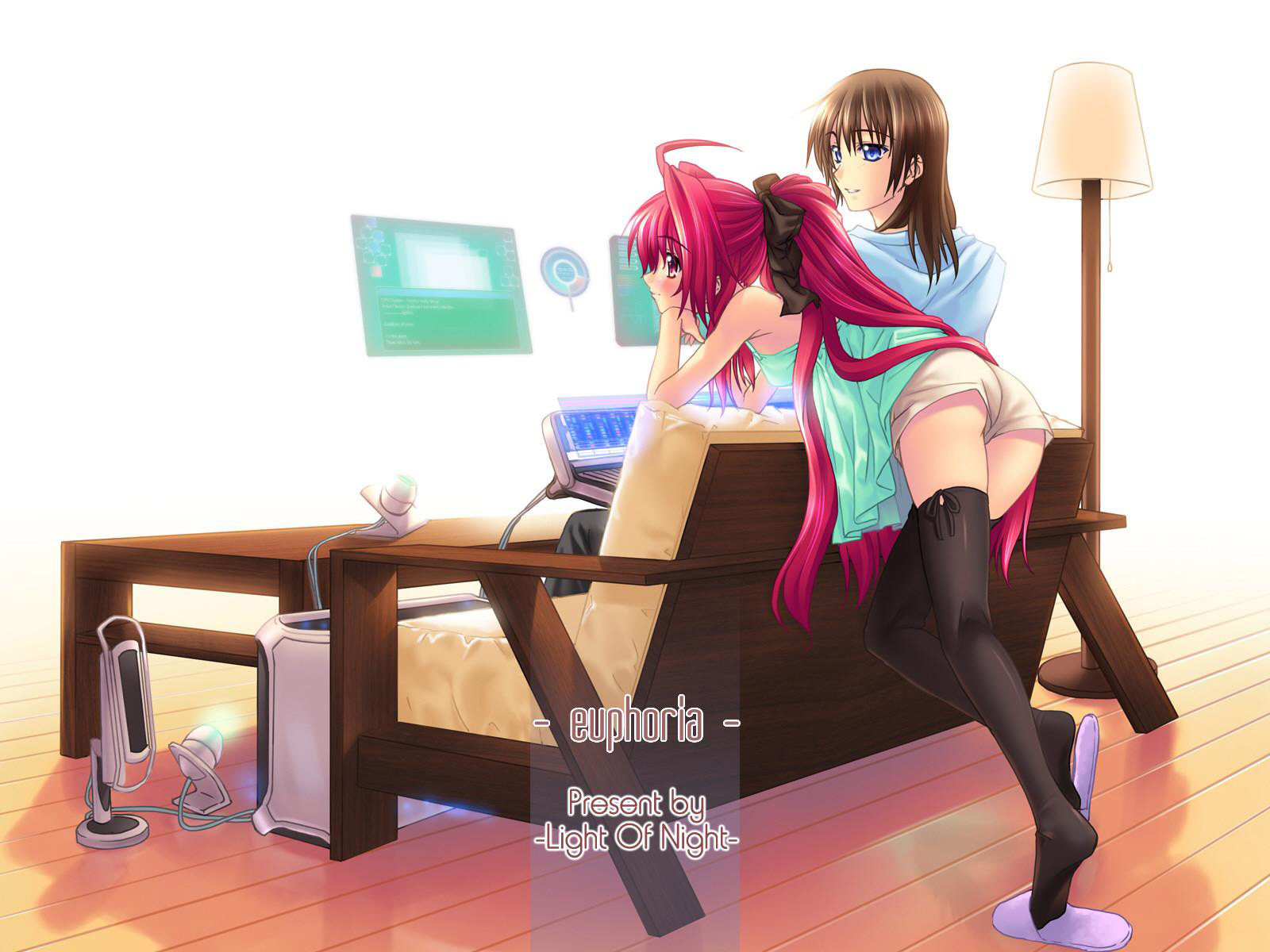 Description: A couple of anime girls sitting at a desk together with a computer monitor and a lamp on the side.