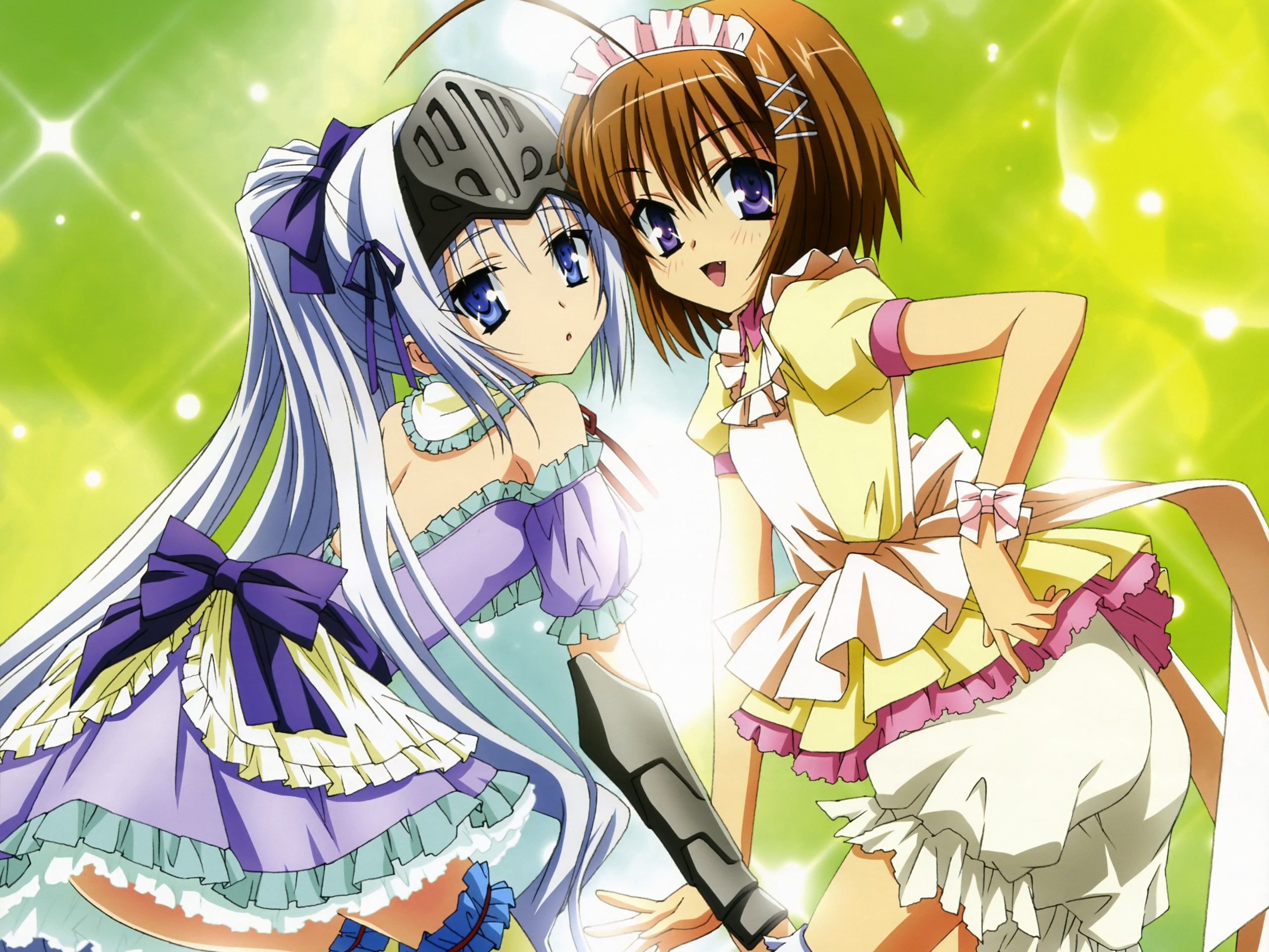 Description: Two anime girls in dresses and helmets posing for a picture together with a green background and stars in the sky.