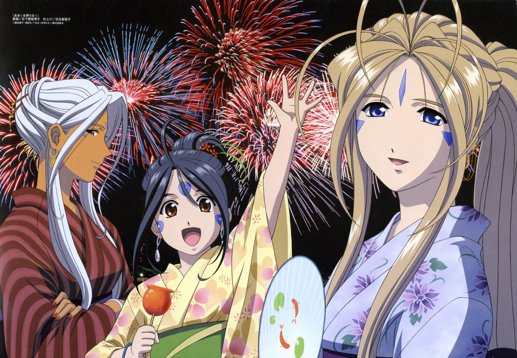 Description: Two anime girls with long hair and blue eyes are standing in front of fireworks and holding a fan in their hand.