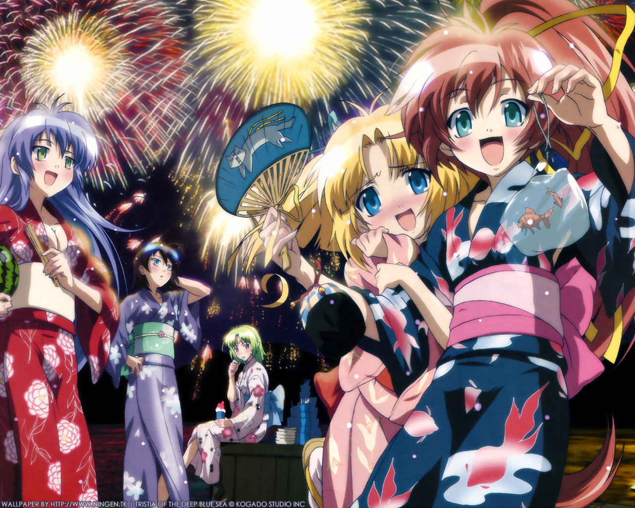 Description: A group of anime girls standing next to each other with fireworks in the background and fireworks in the sky.