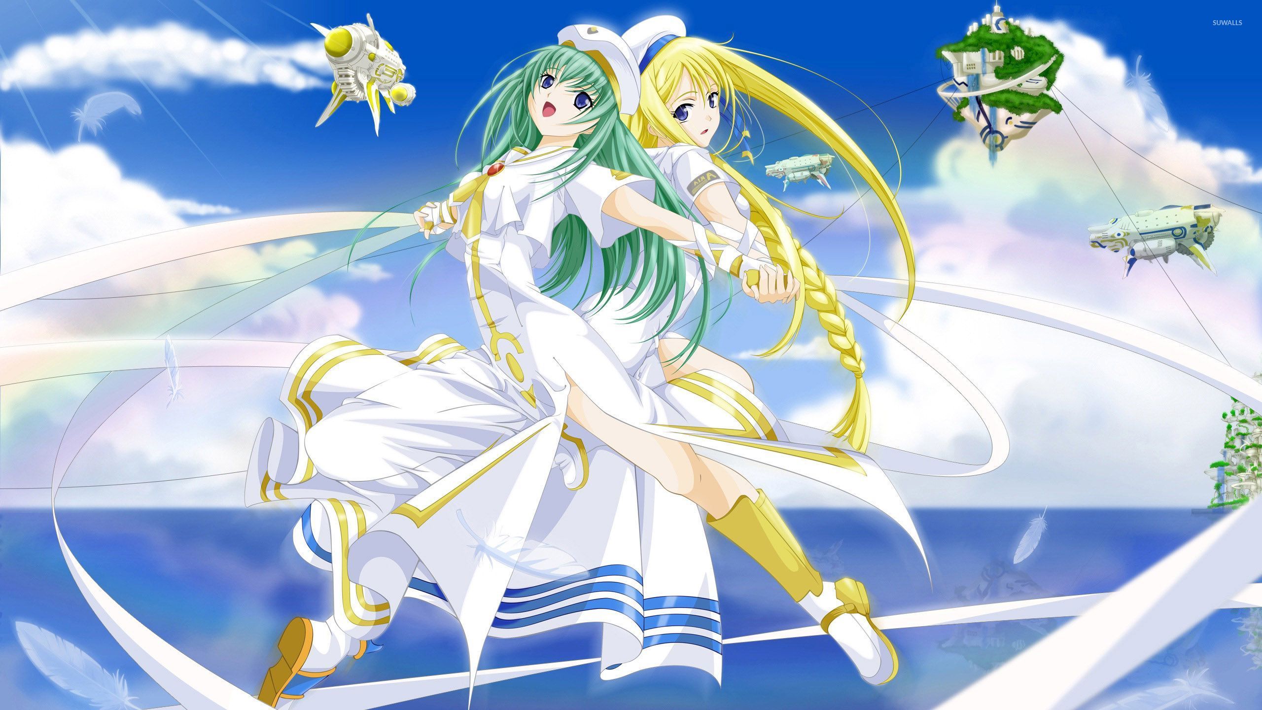 Description: Two anime girls are flying in the sky together with a rainbow in the background and a green tree in the foreground.