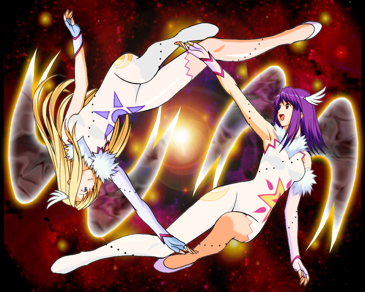 Description: Two anime girls are flying in the air with their legs spread out and their bodies spread out.