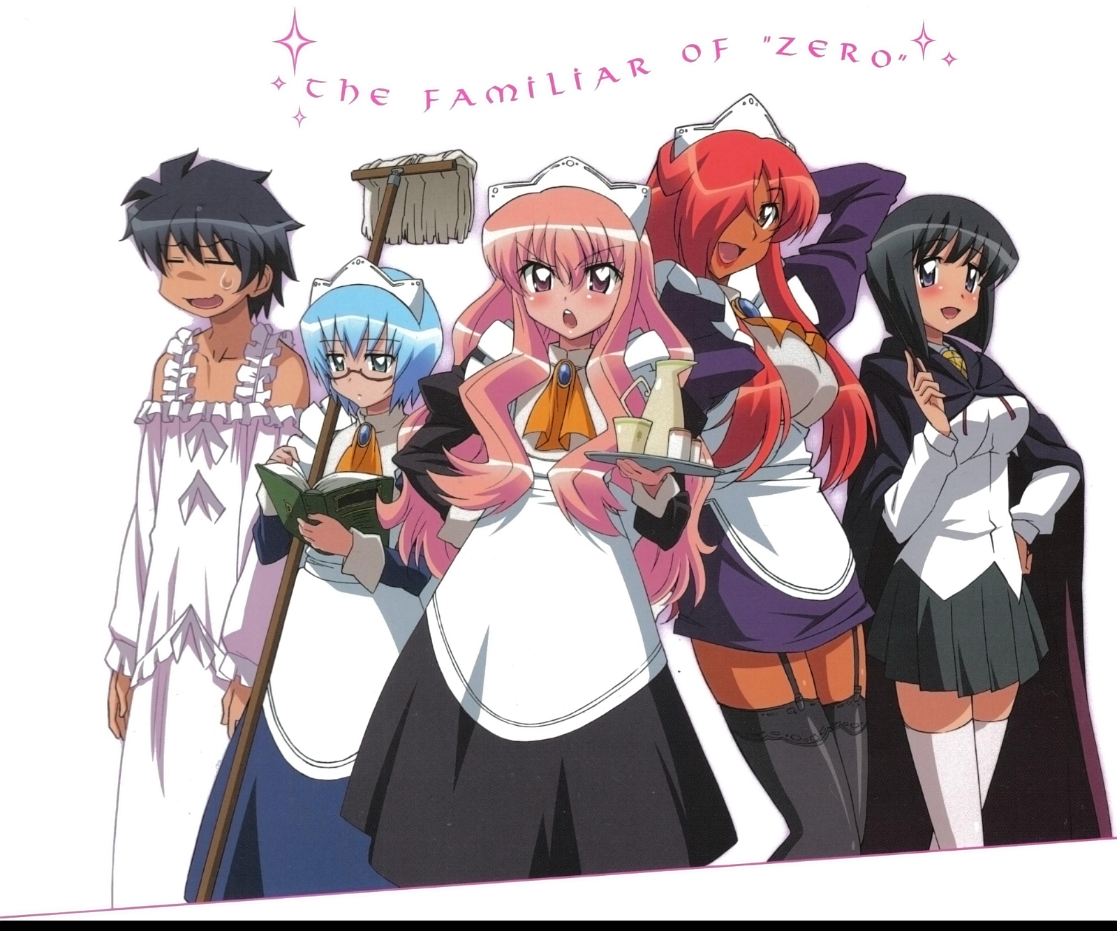 Description: A group of anime girls standing next to each other holding a tray of food and a broom in their hands.