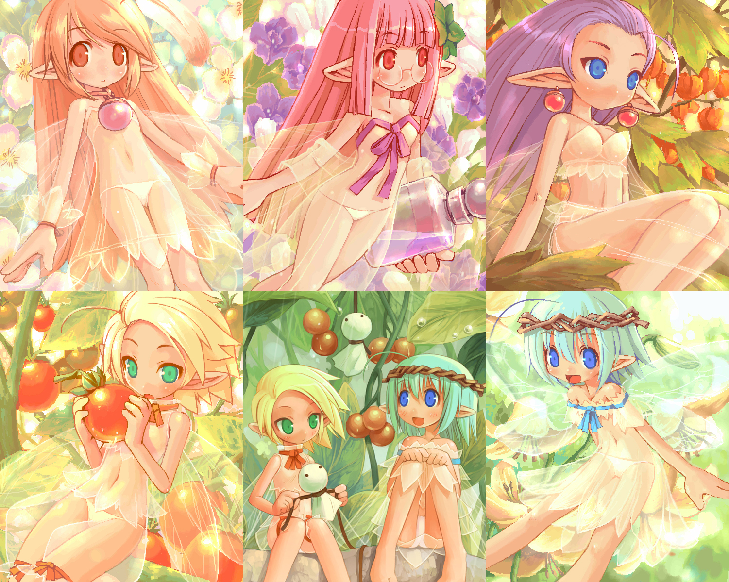 Description: A group of anime girls sitting in a forest with flowers and fruit around them.
