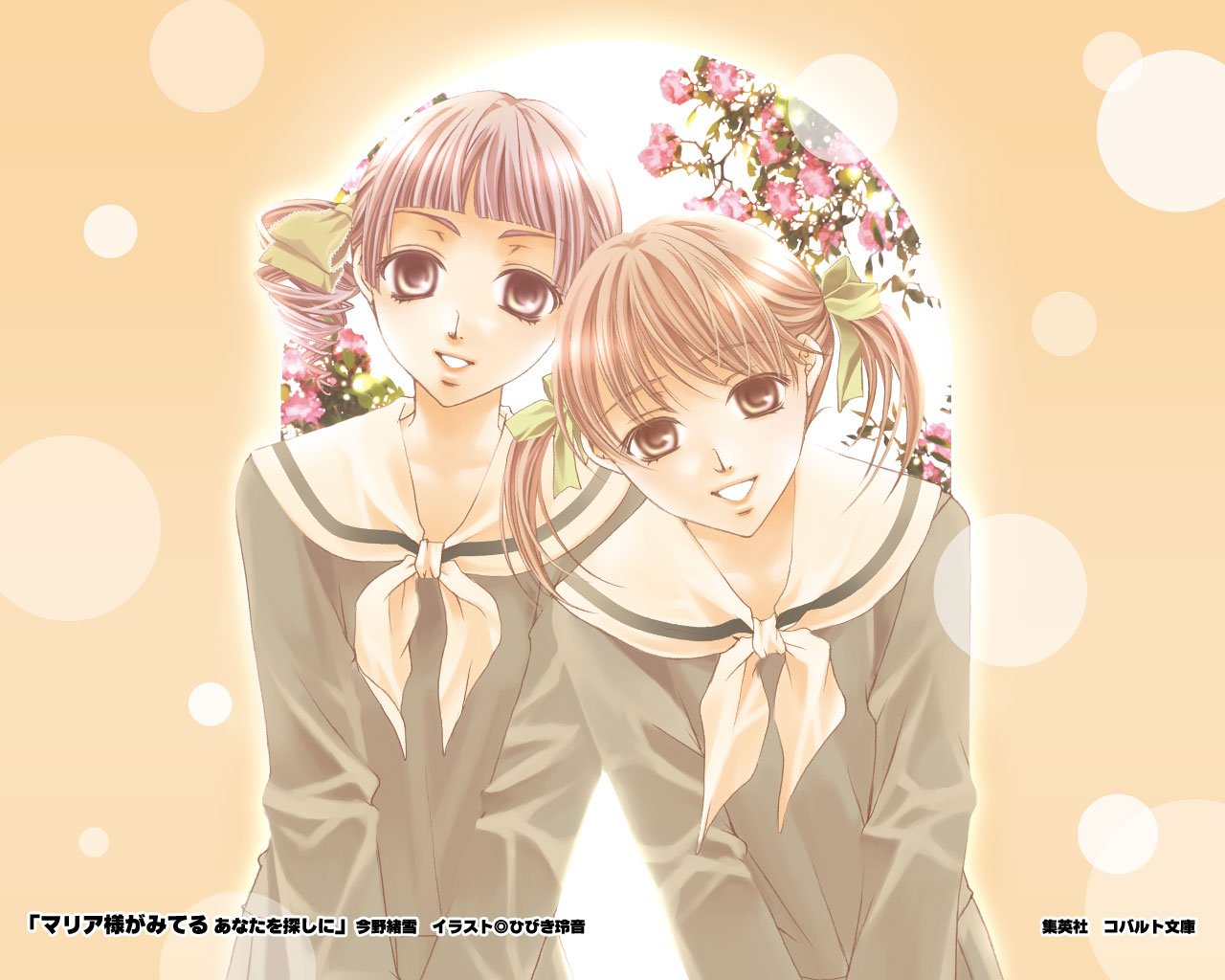 Description: Two anime girls with glasses and bows on their heads are standing in front of a yellow background with bubbles.