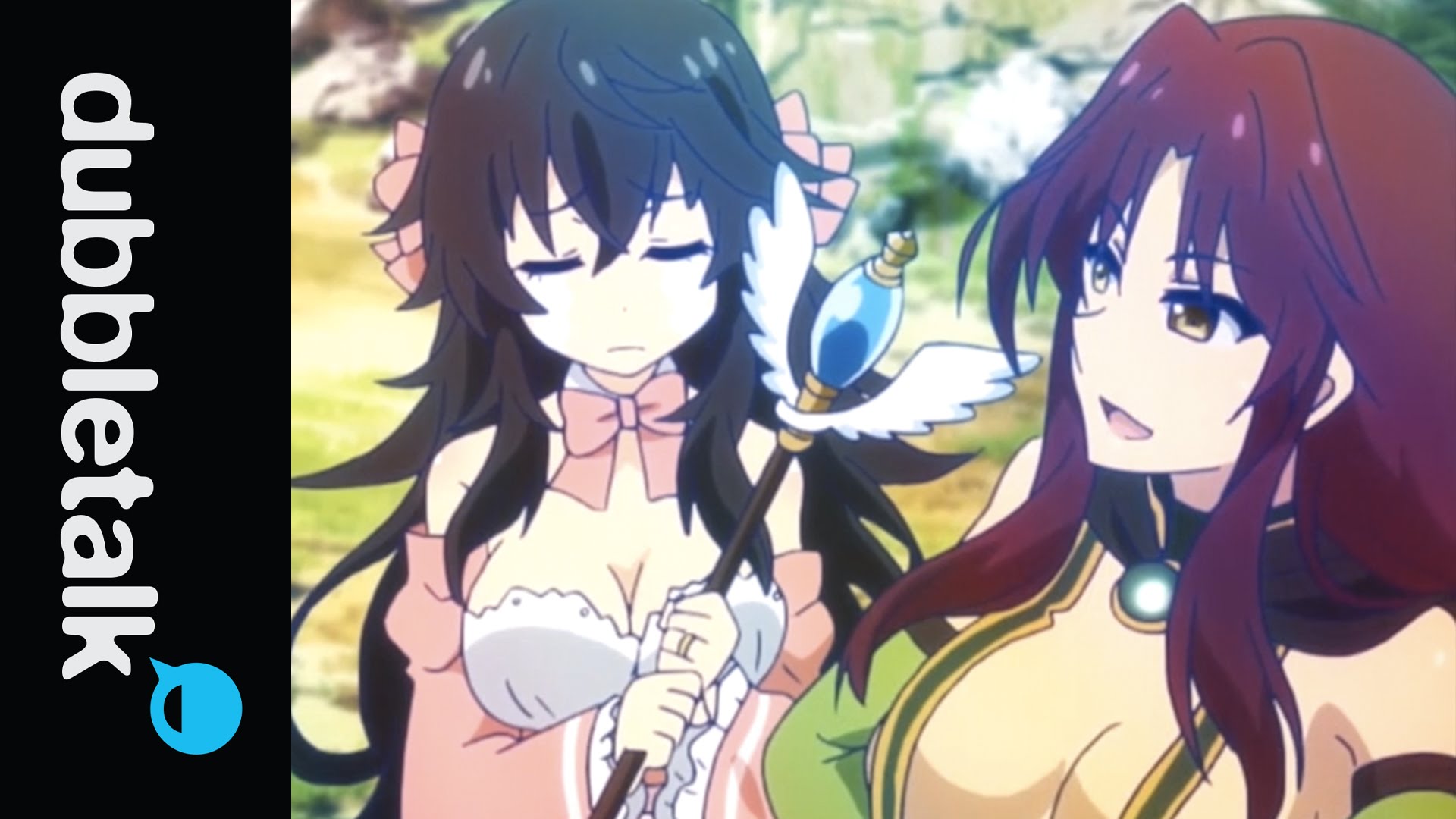 Description: Two anime girls with long hair and a green dress are standing together in front of a tree and a black background.