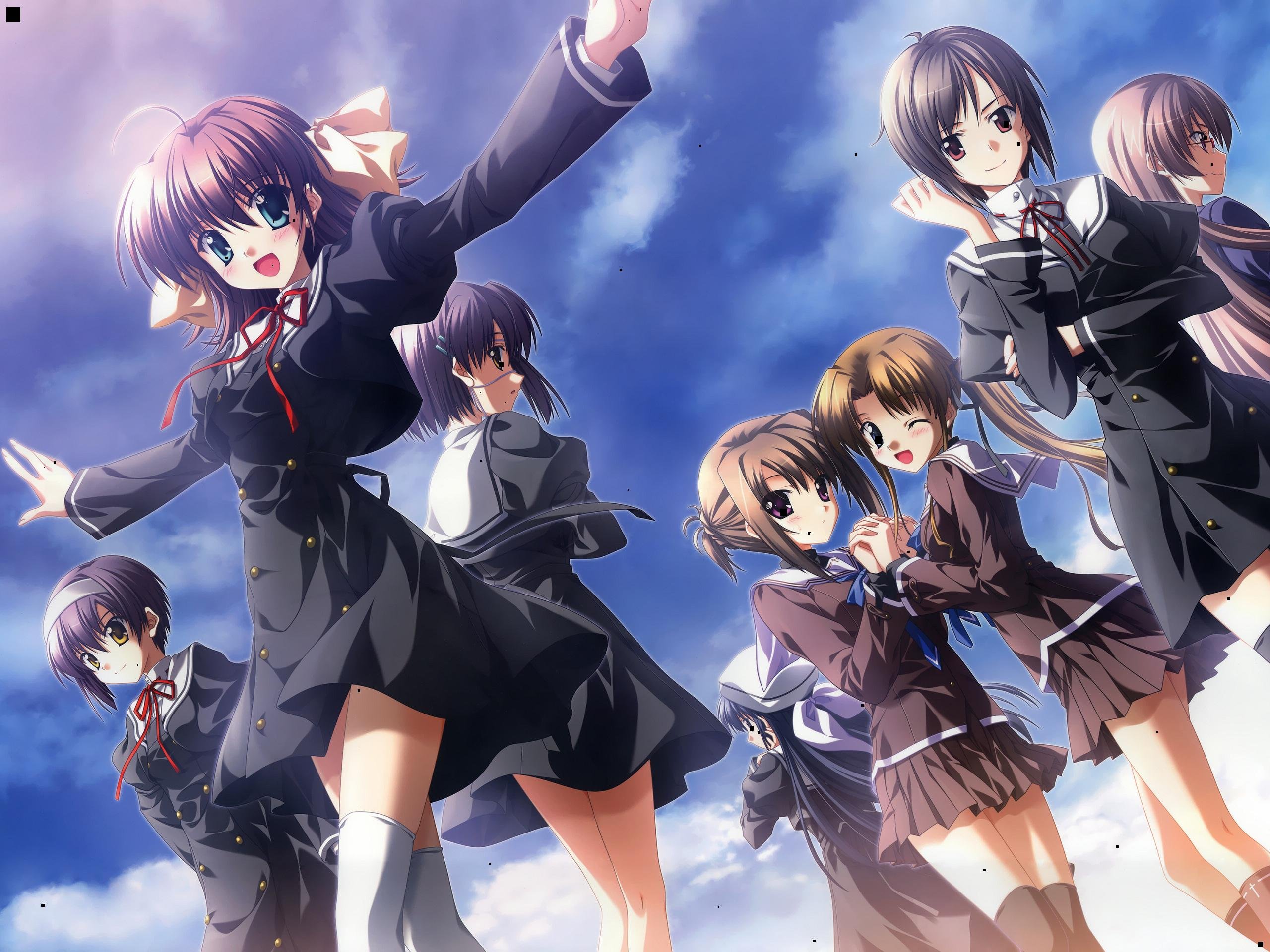Description: A group of anime girls in a group with their arms in the air and clouds in the background.