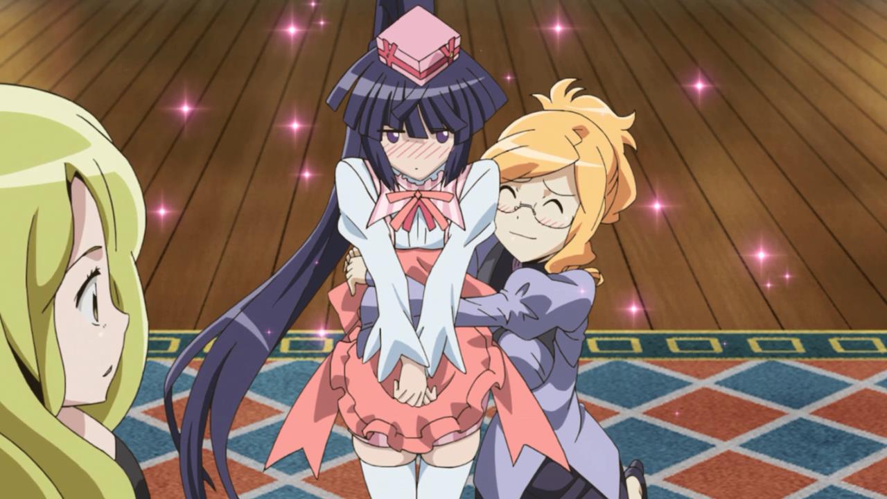 Description: A group of anime girls standing next to each other on a floor with a wooden floor in the background.